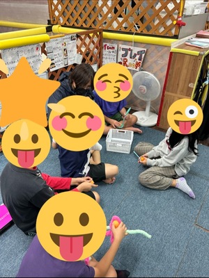 ボールを運ぶ物は縄、箱、スプーン、お玉、トングを用意。順番やボールを運ぶものをチームで相談+練習時間を設けて取り組みました。