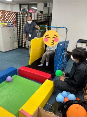 色んな技に挑戦しながら、足で風船を掴んで入れる遊びにも挑戦♪